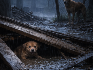 On a stormy evening at an abandoned construction site, a small brown puppy became trapped beneath fallen wooden boards as heavy rain flooded the area. […]