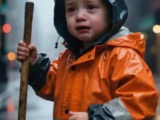 In the middle of a rainy city street, a little boy in a muddy orange raincoat was seen holding a broom, helping his mother clean […]