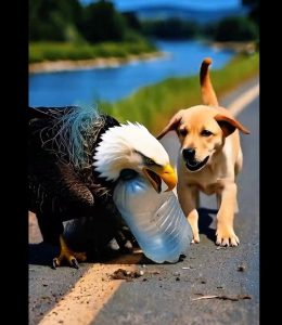 The bald eagle lay motionless on the ground, its powerful wings tangled tightly in a fishing net. A crushed plastic bottle was stuck around its body, cutting into its feathers and limiting every movement. Exhausted and terrified, the eagle struggled to free itself, but every attempt only made the trap tighter. Its strength was fading, and escape seemed impossible.
