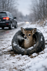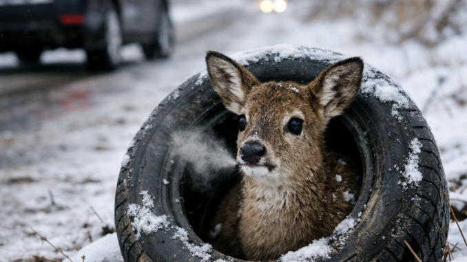 In the frozen silence of winter, where snow blankets the earth and the sky hangs heavy and gray, time seems to slow—and yet, for one small life, it races painfully fast. A young deer is trapped. Panic fills its wide eyes. Its breath comes fast and visible, rising in white clouds into the icy air. Its legs are caught inside an old, discarded car tire, a cruel reminder of what humans leave behind.