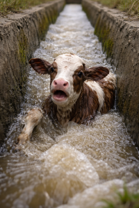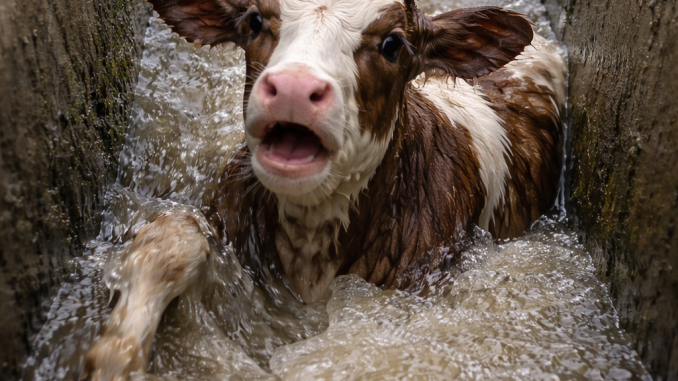 Its legs were soaked. Mud clung to its sides. The steep concrete walls offered no grip, no path back to safety. The calf lifted its head, eyes wide with fear, breathing fast as shallow water rippled around its hooves.