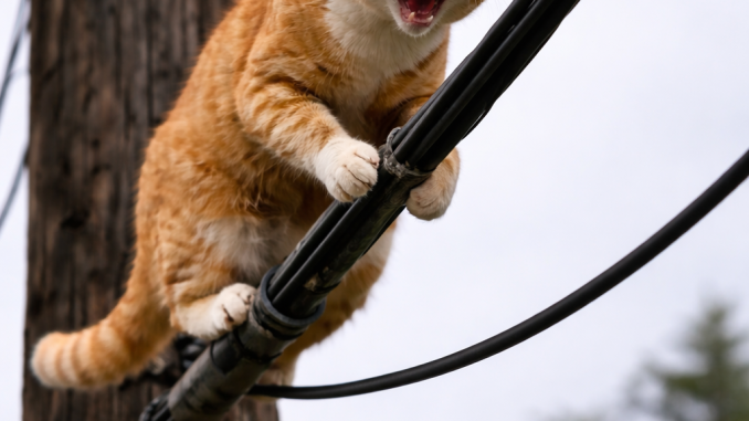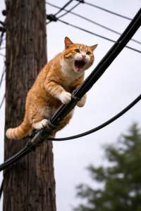 A loud, desperate meow echoed through the air. High above the ground, an orange tabby cat was stuck on power cables wrapped around a wooden utility pole. Its small body trembled as it tried to keep its balance, paws gripping the wires that were never meant to hold it.