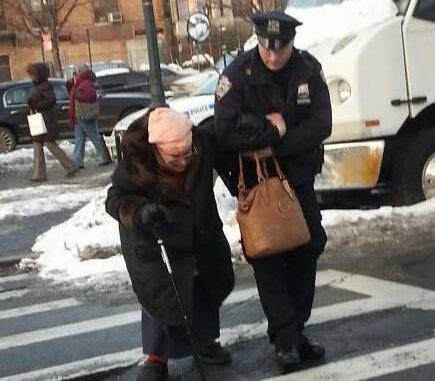 A police officer had stepped into the crosswalk—flat hand up, stopping both sides—and was slowly walking beside an elderly woman with a cane. She had on this oversized brown coat and clutched a tote bag to her chest like it weighed a hundred pounds.