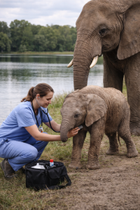 Near the water’s edge, a veterinarian knelt beside a young elephant, carefully treating the small calf. The baby stood still, trusting the gentle hands working around its leg. Just a few steps away, a massive adult elephant watched closely, its presence steady and protective.