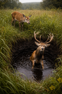 Thick mud and black water filled the deep hole in the ground. Tall grass and wild plants swayed quietly around the edge as a male deer stood trapped inside, its legs sinking deeper with every move.