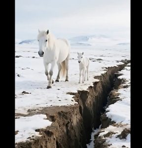The video opens on a quiet but striking scene: a white mare and her tiny foal walking carefully along the edge of a deep, earthy trench cutting through the frozen ground. The foal, curious and unsteady on its legs, takes a wrong step. In a split second, it slips, disappears into the trench, and its cry echoes through the cold air.