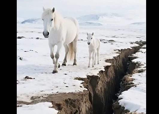 The video opens on a quiet but striking scene: a white mare and her tiny foal walking carefully along the edge of a deep, earthy trench cutting through the frozen ground. The foal, curious and unsteady on its legs, takes a wrong step. In a split second, it slips, disappears into the trench, and its cry echoes through the cold air.