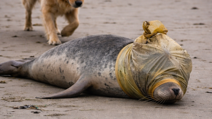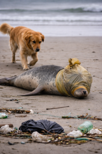 Under a heavy gray sky, a polluted beach stretched quietly toward the ocean. Plastic bottles, tangled ropes, and scattered waste lay across the sand like reminders of what humans leave behind. Among the debris, a grey seal lay motionless, its head trapped inside a dirty plastic bag, rope wrapped tightly around its neck.