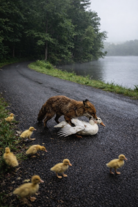 A red fox lunged at a white mother duck. Wings flapped violently against the asphalt. Small yellow ducklings scattered in panic, their tiny bodies slipping on the wet surface.