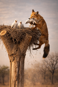 The fox dropped back down, running across the dry grass with a young eagle chick held carefully but firmly in its mouth. Behind it, the nest stood silent — two chicks still inside, frozen in fear.