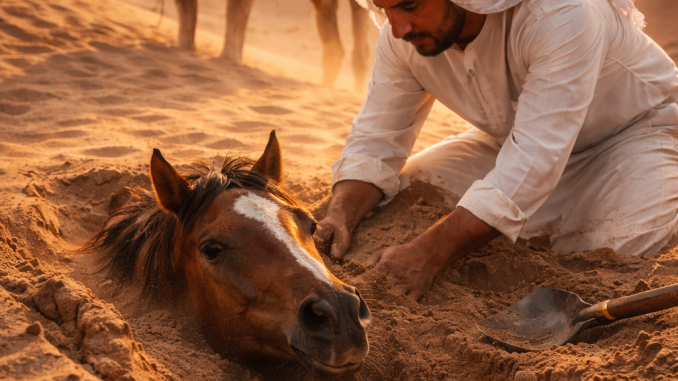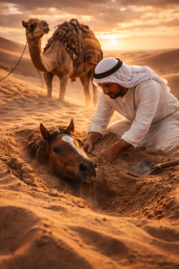 Kneeling beside the trapped horse, the sheikh began digging with his hands and a small shovel. Sand burned against his skin, sliding back into place as fast as he removed it. The camel stood nearby, calm and watchful.