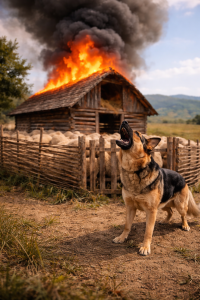 A small wooden sheep shed suddenly caught fire. Flames tore through the roof, and thick black smoke rose fast into the air. Inside the fenced pen, dozens of sheep began to panic, trapped with nowhere to run.