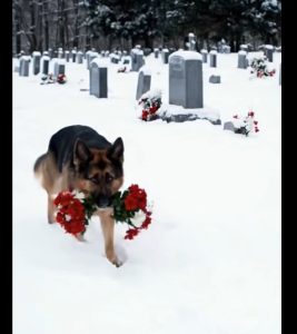 A German Shepherd walks slowly through the cold cemetery, carrying a small bouquet of flowers in his mouth. He knows exactly where he is going. No hesitation. No confusion. Only purpose.