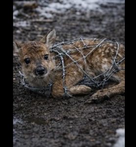 A baby deer had become trapped in a metal wire hidden beneath the snow.