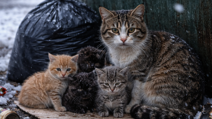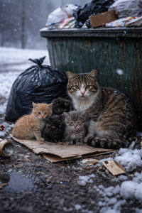 Winter daylight painted everything in soft white and pale blue. Near a lonely trash bin on the roadside, a mother cat huddled tightly around her tiny kittens. Their small bodies pressed together for warmth, their fur lightly dusted with snowflakes that fell without mercy from the cold sky.