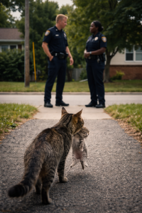 The officers were on routine patrol when a mother cat approached them carrying her small kitten in her mouth. Instead of running away, she walked directly toward them and gently placed the fragile kitten on the pavement.