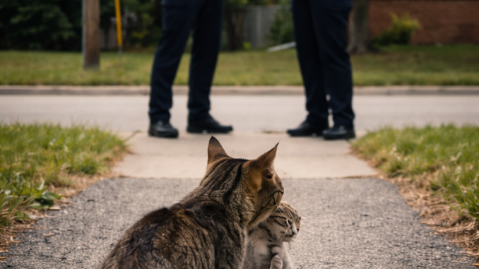 The officers were on routine patrol when a mother cat approached them carrying her small kitten in her mouth. Instead of running away, she walked directly toward them and gently placed the fragile kitten on the pavement.
