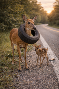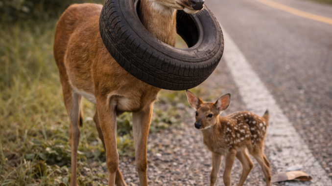 Around her neck hung an old car tire, heavy and tight against her chest. Every movement she made looked uncomfortable. Beside her stood a small fawn, watching closely, unsure why its mother couldn’t walk freely.