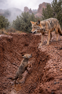 At the edge of the steep ravine stood a mother coyote.