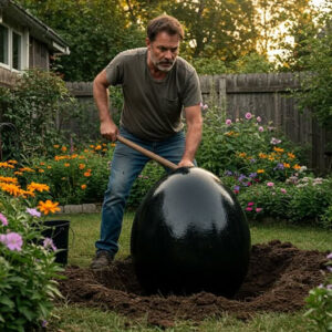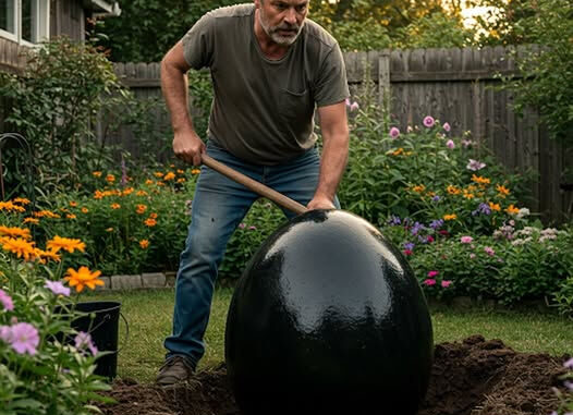 When I arrived, the house was silent, exactly as I had anticipated. Assuming Ben was in his office, I wandered into the backyard—only to freeze in my tracks. Near the garden, Ben was hurriedly digging a hole, his movements frantic. In front of him lay something extraordinary: a massive, glossy black object that could only be described as a giant egg.