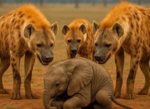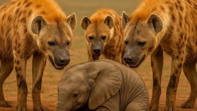 The baby elephant spread his ears wide and trumpeted, trying to scare the predators away. But they only drew closer. One hyena lunged forward and slashed his side with its claws. He squealed and called desperately for his mother. The herd heard his cry, and the massive cow charged toward him, but the distance was too great – she would never make it in time.