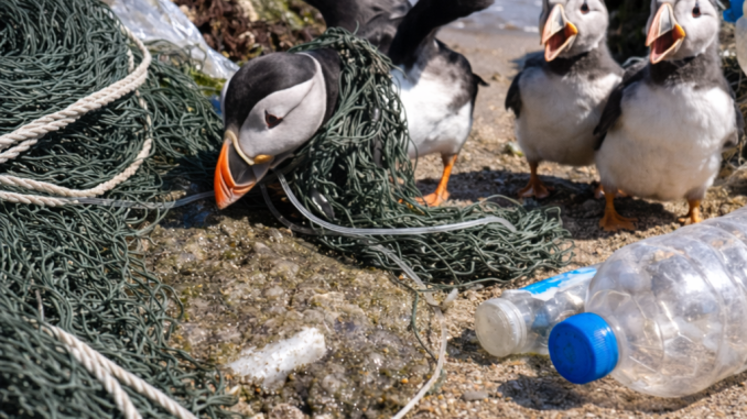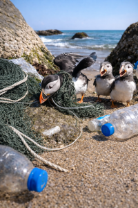 The puffin was wedged between jagged coastal rocks, green fishing net wrapped tightly around its wing and body. Plastic bottles and rope were scattered across the wet stones, carried in by the tide. The ocean rolled in behind them, calm but relentless.