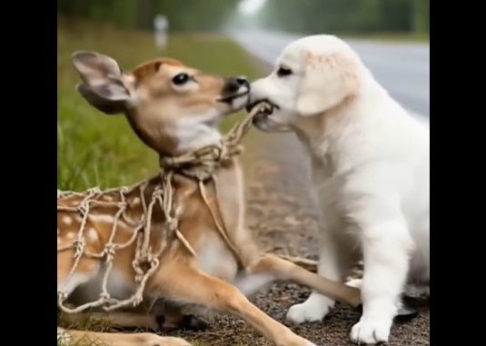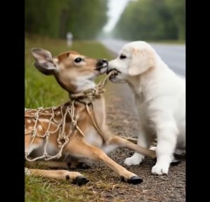 Beside a busy road, a young deer was trapped inside a tight net — exhausted, frightened, and unable to escape. Cars passed by, the danger growing with every second.
