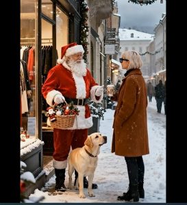 As she bent down to gather her things, she glanced toward the door… where the old Santa was still standing, smiling gently — this time with the dog proudly sitting beside him.
