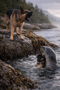 From the water below, a sleek shape emerged — a curious seal lifting its head between the waves. The puppy leaned forward, tail wagging slightly, unaware of the danger. In a sudden, shocking moment, the seal gently but firmly lifted the puppy into the cold water near the rocks.