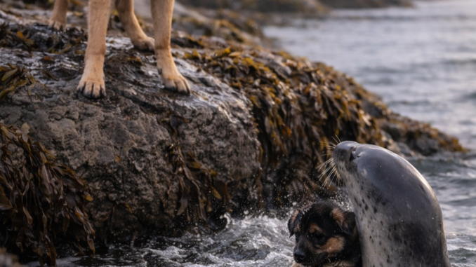 From the water below, a sleek shape emerged — a curious seal lifting its head between the waves. The puppy leaned forward, tail wagging slightly, unaware of the danger. In a sudden, shocking moment, the seal gently but firmly lifted the puppy into the cold water near the rocks.