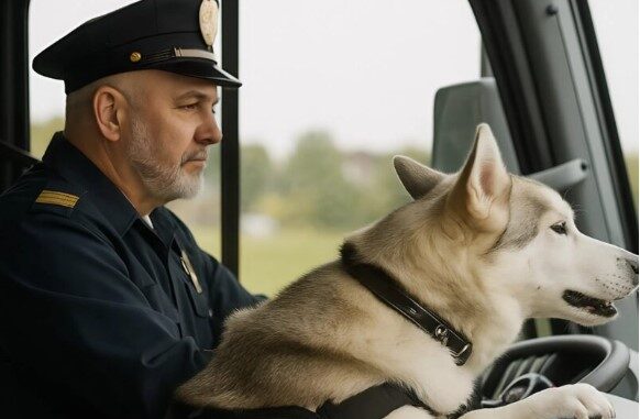 A uniformed police officer was sitting on a city bus. Next to him, on the front seat, calmly sat his loyal service dog – a smart husky. For the passengers, this was already a familiar sight: the dog didn’t bother anyone, quietly looked out the window, observed the passing scenery, and seemed to enjoy the calm ride.