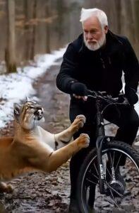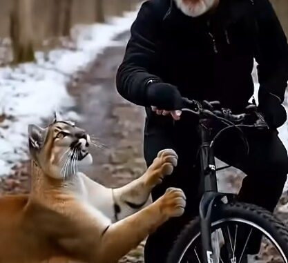 In the heart of a quiet forest, where the paths are covered with patches of snow and the air carries a crisp chill, a rare encounter unfolded that left everyone stunned. A man was riding his bicycle along a rugged woodland trail when he noticed a large figure moving toward him. At first glance, it appeared to be a cougar, powerful and cautious, stepping slowly across the narrow path.