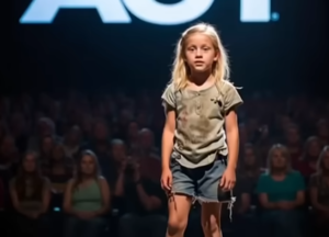 The stage lights blazed as a tiny figure walked out, her bare feet padding softly against the floor. She couldn’t have been more than seven years old. Her hair was slightly messy, her clothes worn and patched, the kind that told a story of struggle without a single word spoken.