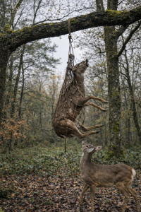Deeper in the woods, the truth revealed itself. A large deer—trapped in a hunting net—hung helplessly from a tree. Exhausted. Terrified. Still alive. Below her stood the young deer, waiting, as if it knew help had finally arrived.