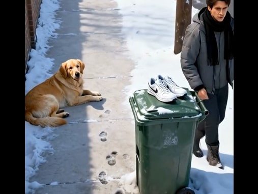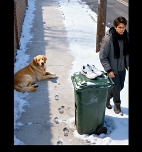 Nearby, a young man tossed a brand-new pair of shoes on top of a trash bin, walking away without a second thought.