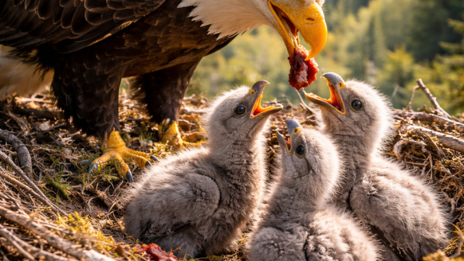 An adult eagle stands tall in a wide, carefully built nest. Beneath its powerful wings, small eaglets sit close together, their soft feathers rustling in the daylight breeze. The world below is quiet, wrapped in green forests and distant hills.