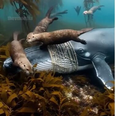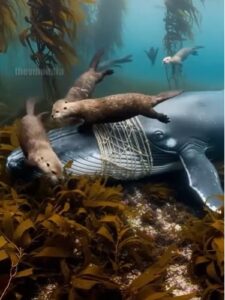 With sharp teeth and nimble paws, they began to gnaw and tear through the tangled mess — ripping away thick strands of kelp, dragging out pieces of plastic, and diving again and again beneath the massive whale’s body.