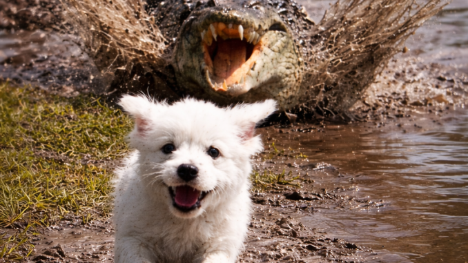 A massive crocodile burst from the swamp, jaws wide open, teeth sharp and glistening. Each step the puppy took seemed too small, too slow. The crocodile moved like a missile, powerful and unstoppable, closing the distance with terrifying speed.