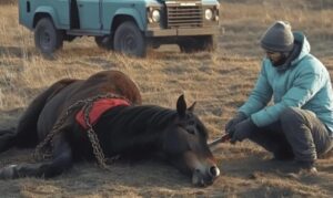 What followed was profoundly moving. The stallion lifted his head and, in a rare gesture of trust, gently placed his muzzle against Ovidiu’s shoulder. A silent, pure, and profound thank you. The veterinarian, overwhelmed, stood frozen, eyes shining with tears at the fragile yet unbreakable bond woven between man and animal.