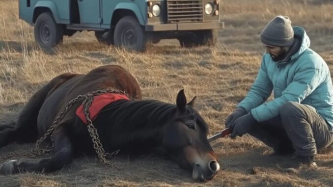 Then began an arduous task. Every link was welded with rust, every movement of the cutters felt like a battle. Between efforts, Ovidiu stroked the horse’s neck and spoke in a soothing voice: Just a little longer… freedom is so close.