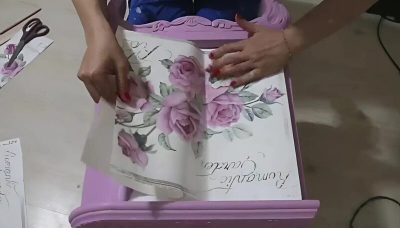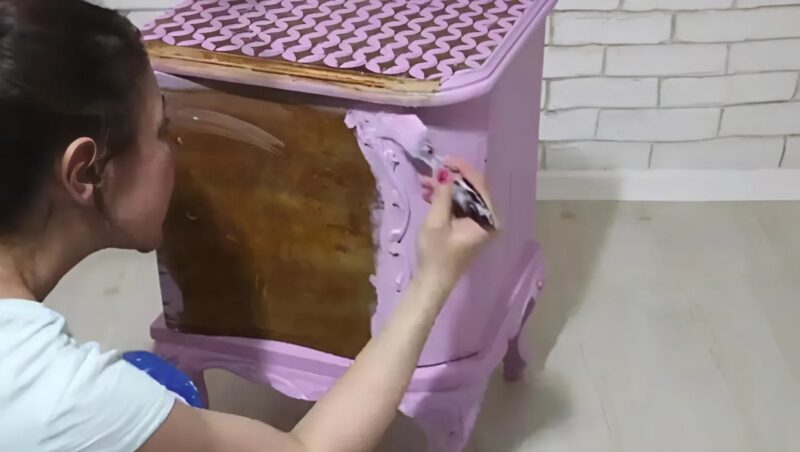 Once the surface was in good condition, she focused on adding character to the top. Using a stencil, she created a unique design, giving the dresser a personal and stylish touch. For the paint, she chose a soft lavender shade—both elegant and calming—which beautifully highlighted the structure and details of the piece.