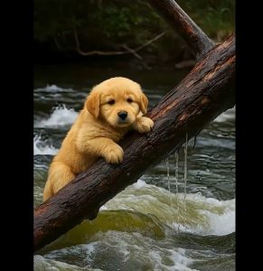Near the edge of a wide, fast-moving river, a small puppy found itself in danger. Too young and weak to swim against the current, it had become trapped by a fallen tree branch tangled near the water. The river pushed against its tiny body as the puppy whimpered helplessly, unable to free itself.