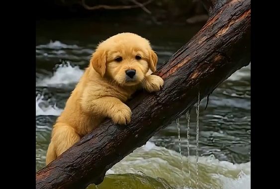 Near the edge of a wide, fast-moving river, a small puppy found itself in danger. Too young and weak to swim against the current, it had become trapped by a fallen tree branch tangled near the water. The river pushed against its tiny body as the puppy whimpered helplessly, unable to free itself.