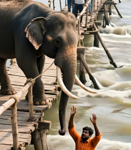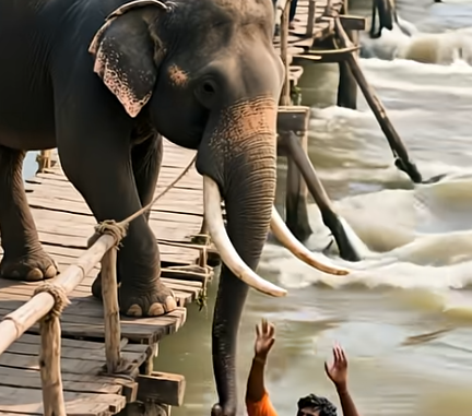 Slowly, the man rose from the deadly waters, held not by a rope, not by human hands, but by the compassion of an animal many had underestimated. His body, soaked and trembling, was pulled closer to the wooden bridge, his salvation carried in each movement of the elephant’s trunk.