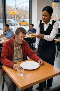 One waitress approached him with irritation. She assumed he couldn’t pay. She pointed at him and told him he shouldn’t be there. He didn’t argue. He just kept his head down and stared at the empty plate in front of him.