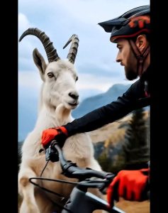 While cycling along a remote mountain path, a man suddenly encountered a large white goat blocking his way. The animal stood tall on its hind legs, bleating urgently. At first, the biker was startled—but soon realized this was not aggression. The goat’s eyes and movements spoke of desperation, as if pleading for help.