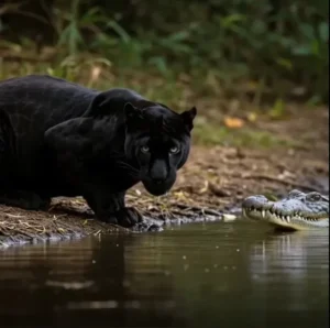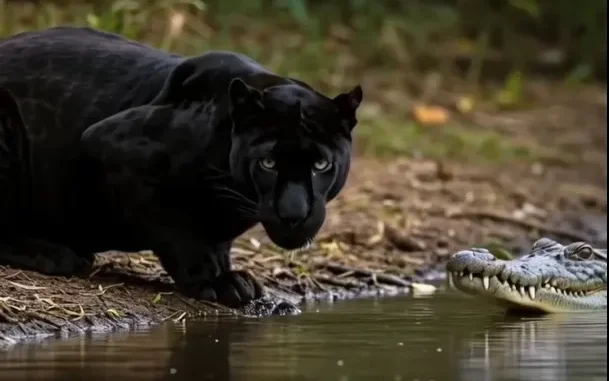 In the heart of the wild, where only the strongest survive, a dramatic encounter unfolded by a murky riverbank that left even seasoned wildlife watchers in awe.A majestic black panther — sleek, silent, and powerful — had approached the water’s edge for a drink, unaware that a deadly predator lay in wait just beneath the surface.