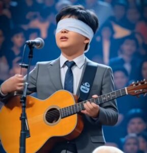 As the song built to its final refrain—“I carry light within the dark; it never fades away”—Noah poured every ounce of his spirit into the last chorus. The blindfolded singer tilted his head back, guitar cradled against him, and held the final note until it shimmered into silence.