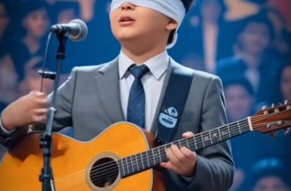 When 12-year-old Noah stepped onto the “America’s Got Talent” stage, striding confidently in a sharp gray suit, most viewers couldn’t help but notice the gentle guide dog calmly at his side. The Labrador Retriever, golden fur gleaming under the spotlights, sat obediently while Noah adjusted his guitar strap and took his place before the microphone—eyes covered by a soft blindfold. In that moment, the audience sensed they were about to witness something truly special.