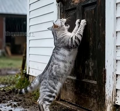 As Liam passed by the front window, he noticed a flash of silver moving near the old wooden door. When he opened it, the sight froze him in place. A drenched cat stood on her hind legs, clawing at the door with trembling paws. Her eyes were wide with panic.